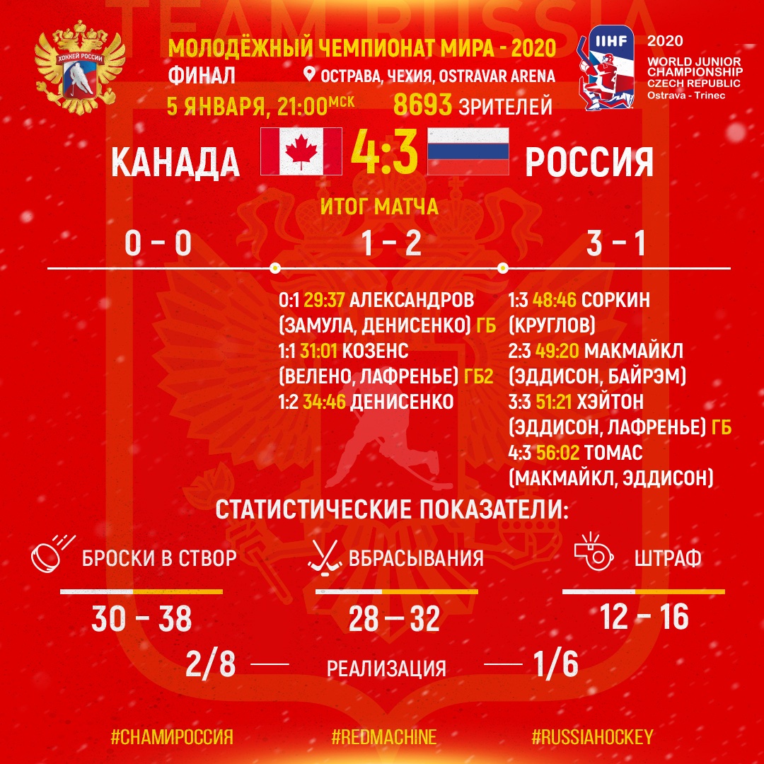 Россия Канада Счет / Rossiya Kanada Hokkej 5 Yanvarya Chempionat Mira 2020 Sredi Molodezhi Schet Sostav Dg News. Сборная россии по хоккею уступила канаде в четвертьфинале чм в риге и вылетела с турнира. Россия — канада — 1:2 от (0:0, 1:0, 0:1, 0:1). Сборная канады выиграла россию в четвертьфинале чемпионата мира по хоккею. Канада в полуфинале сыграет с финляндией. Тимкин 35' (1:0), хенрик 46' (1:1), манджапане 63' (1:2).